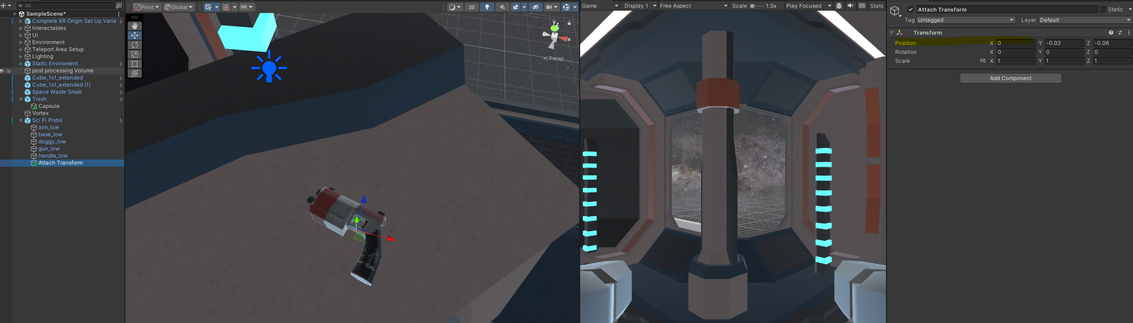 attach transform 에는 총을 집었을 때, 손 위치가 손잡이 부분에 갈 수 있도록 새로운 객채를 만든 후 위치를 조정해주었습니다. 참고로 이때 x 가 0이 아니면 양손 다 집어지지 않는 문제가 있으니 X 값은 0으로 바꿔줍니다.