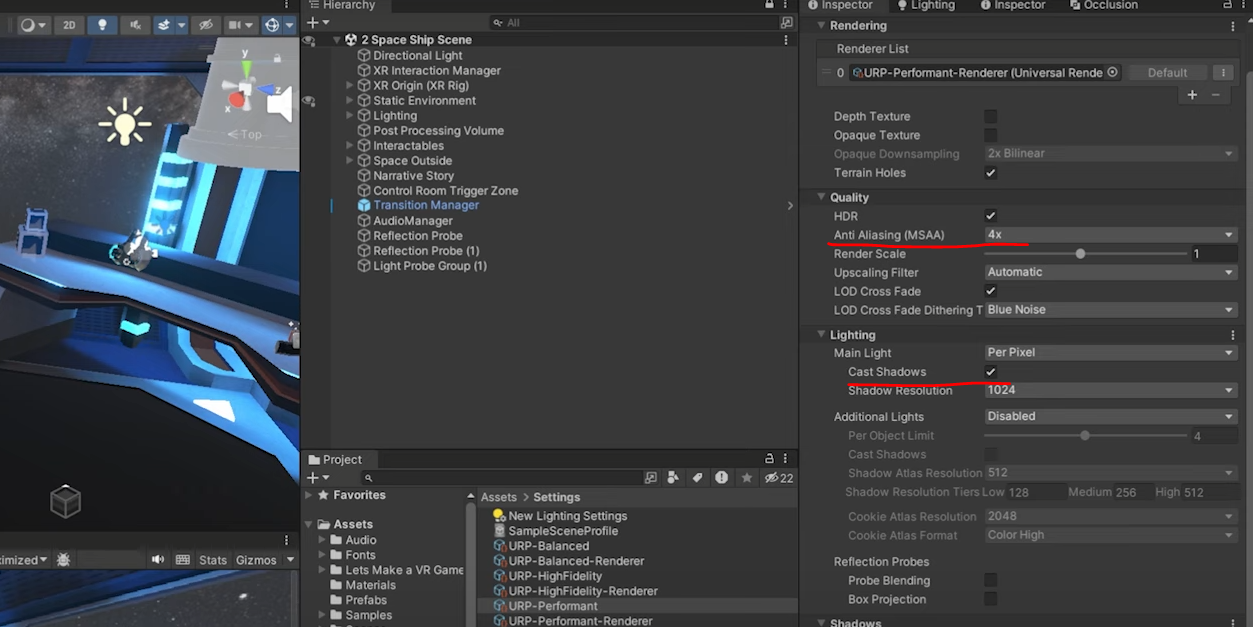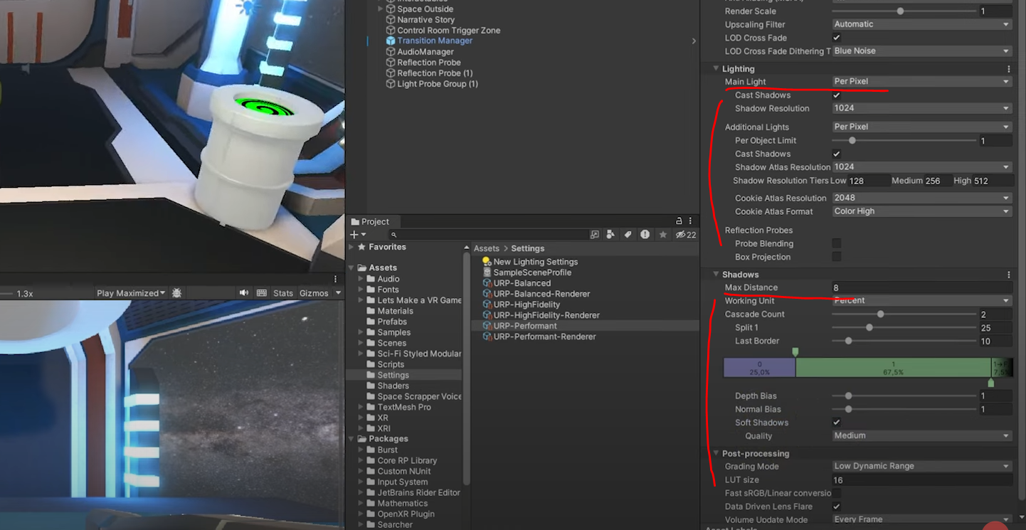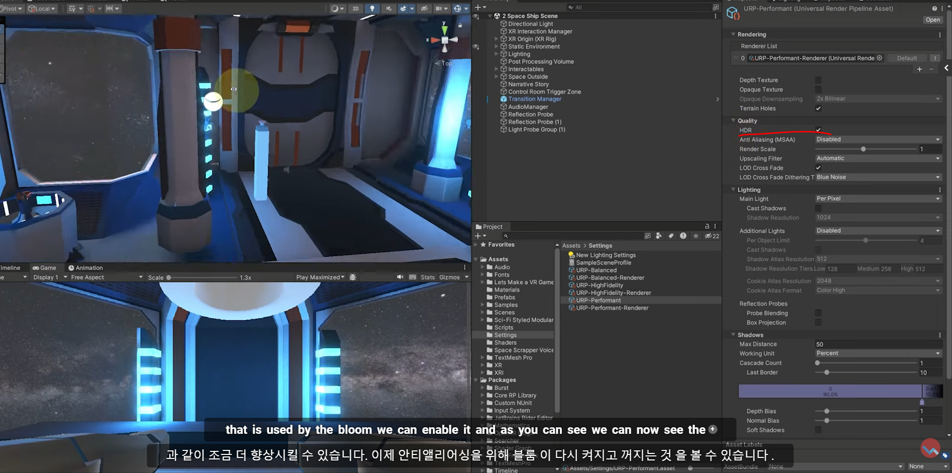 현재는 URP로 되어 있는데 HDR을 사용하는게 저희가 전에 설정한 bloom 빛 효과를 더 향상시킬 수 있습니다.