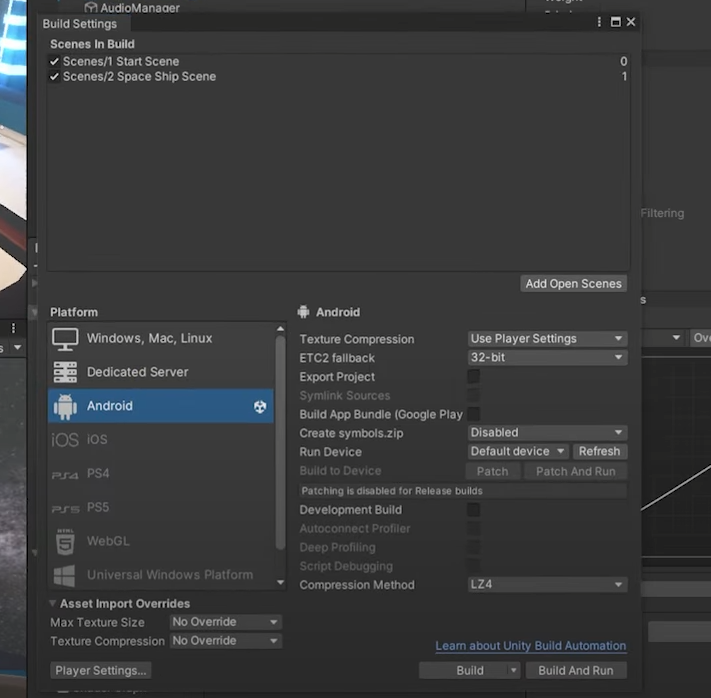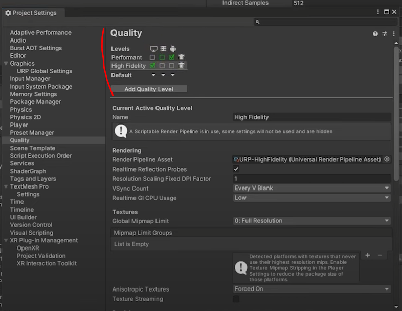 안드로이드 빌드할 때 사용할 성능에 대해 텍스처 스트리밍을 통해 빛을 더 좋게 바꾸고 싶다면 아래와 같이 세팅해줍니다.