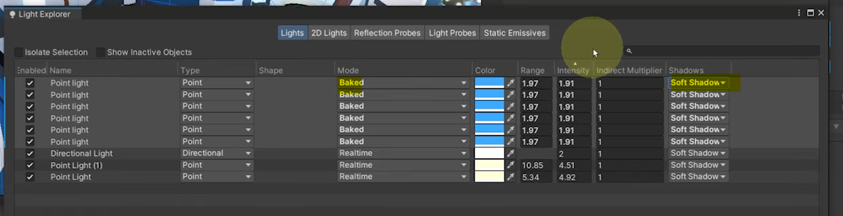 고로 움직이는 빛이 아니라면 baked 를 통해서 고정시켜주면 좋습니다. 그림자도 가볍게 해줍니다.