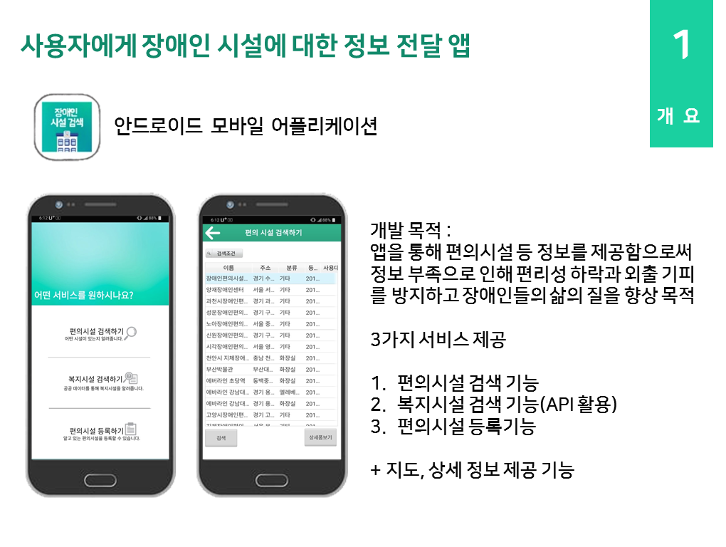 장애인들의 외출 불편 정도를 조사하여 제일 큰 불편 이유가 장애인 관련 편의시설 부족이라는 문제점1을 끌어왔고 장애인 편의시설 수에 비해 이용빈도 수가 낮고 그러한 이유는 정보 부족이라는 문제점2을 가져왔습니다. 그리고 이러한 문제점을 장애인 편의시설 정보 전달 앱을 통해 해결하고자 하였습니다.