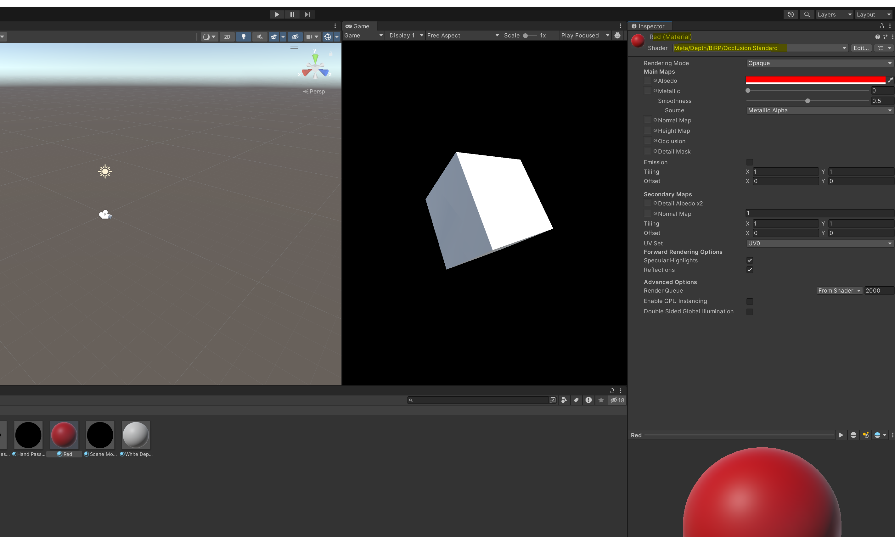 큐브에 depth 반영된 새로운 material 을 만들어주기 위해 아래와 같은 shader 를 담은 새 material 를 만들어줍니다.