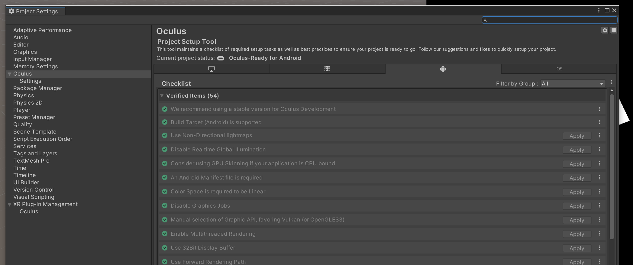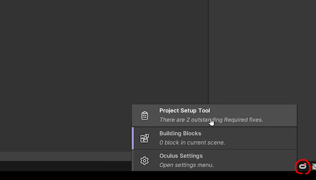 참고로 문제가 없는지 아래 하단에 oculus 아이콘을 누르고 project setup tool 를 누르면,