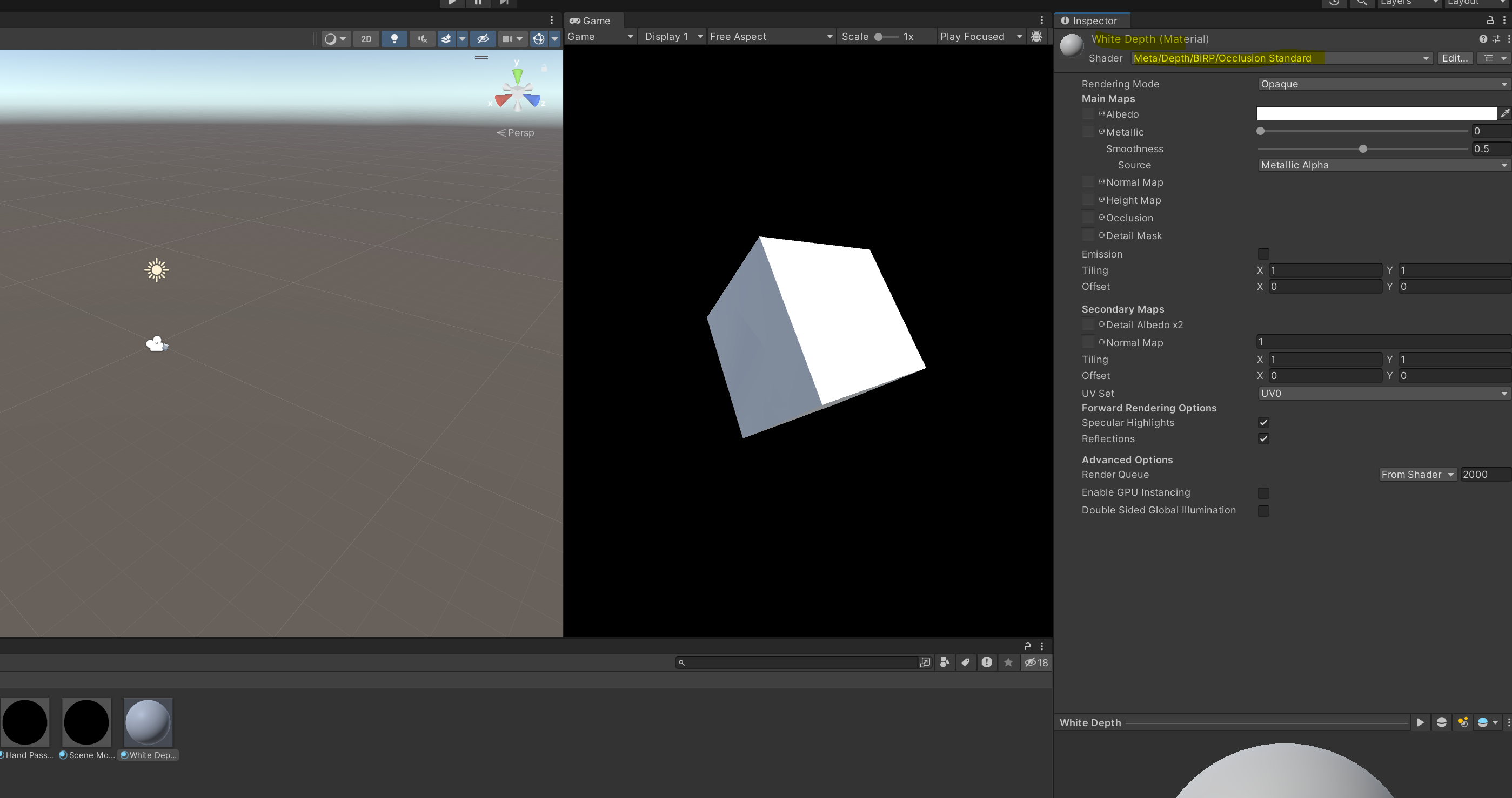 그 다음 위에서 복제해 만든 Global Mesh Renderer Collider Depth 를 두 번 클릭해서 들어간 다음, 아래와 같이 방금 복제한 material 을 넣어줍니다.