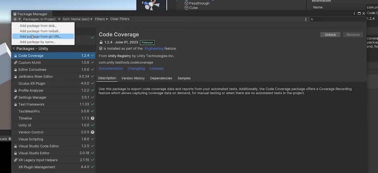 유니티에서 package manager 를 열고 왼쪽 상단 + 를 눌려서 URL 부분을 선택해줍니다.