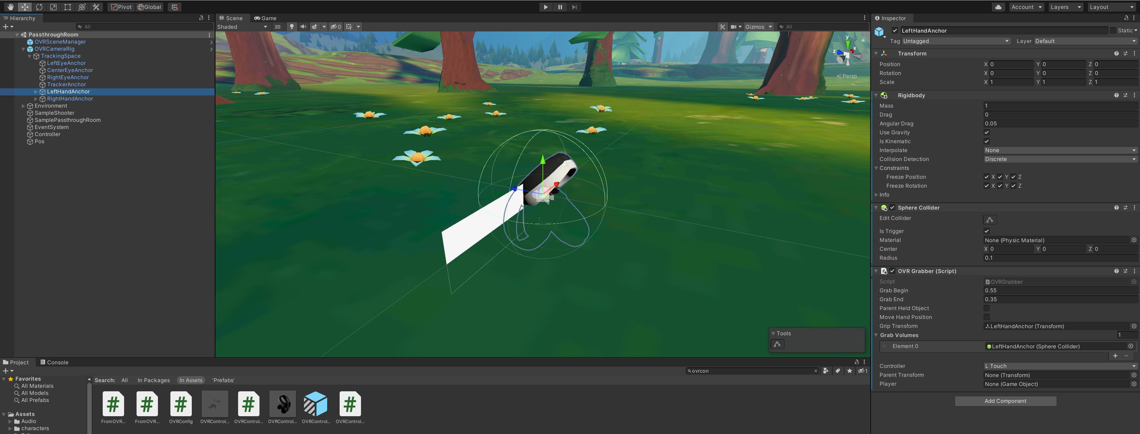 아래 사진과 같이 LeftHandAnchor / RightHandAnchor 에 옆에와 같은 컴포넌트를 설정해줍니다. 이때 collider grab 할 수 있는 범위를 나타냅니다.