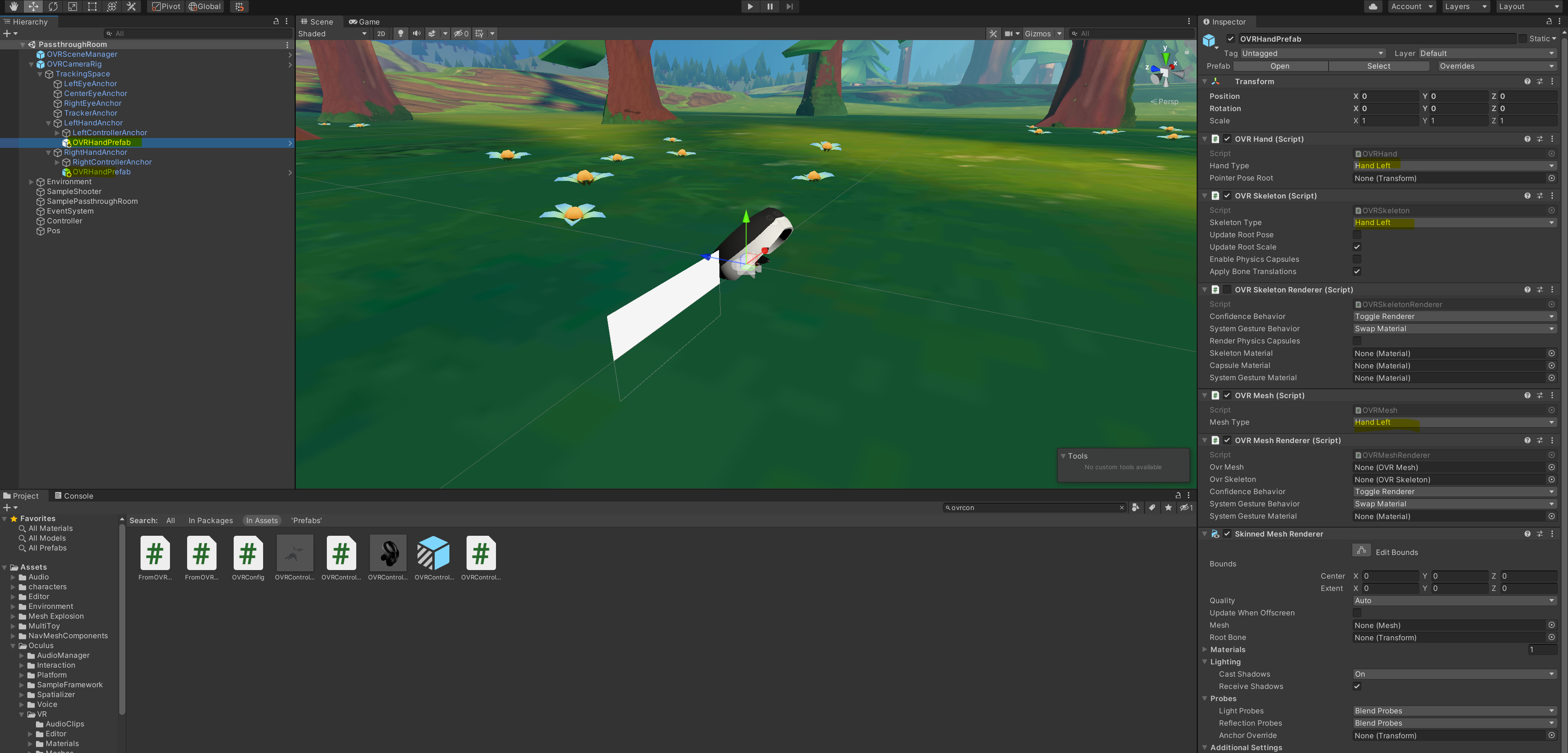 정확히는 손 오브젝트가 아닌 oculus에서 기본적으로 제공해주는 컨트롤러 3D 오브젝트를 달아보겠습니다 먼저 LeftHandAnchor 와 RightHandAnchor 아래에 기본적으로 제공하는 OVRHandPrefab 을 넣어주고 아래처럼 손 위치에 맞게 바꿔줍니다.