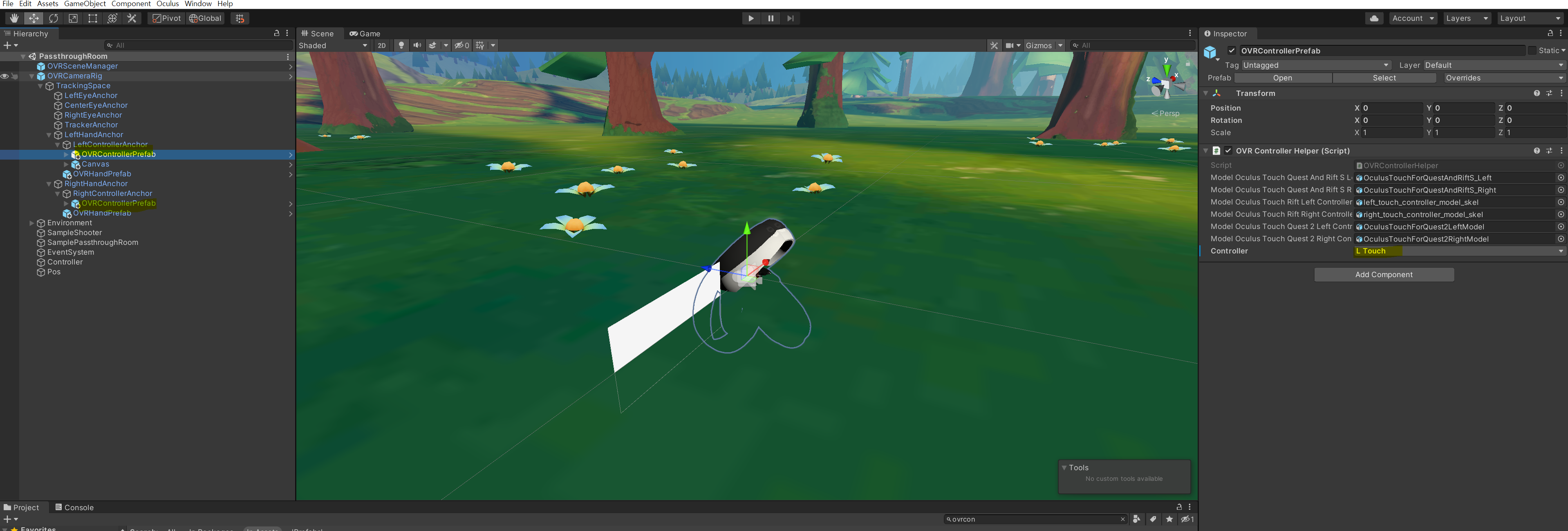 그 다음으로는 LeftControllerAnchor 와 RightControllerAnchor 아래에 OVRControllerPrefab 을 넣어주고 아래처럼 손 위치에 맞게 설정해주면 끝입니다!