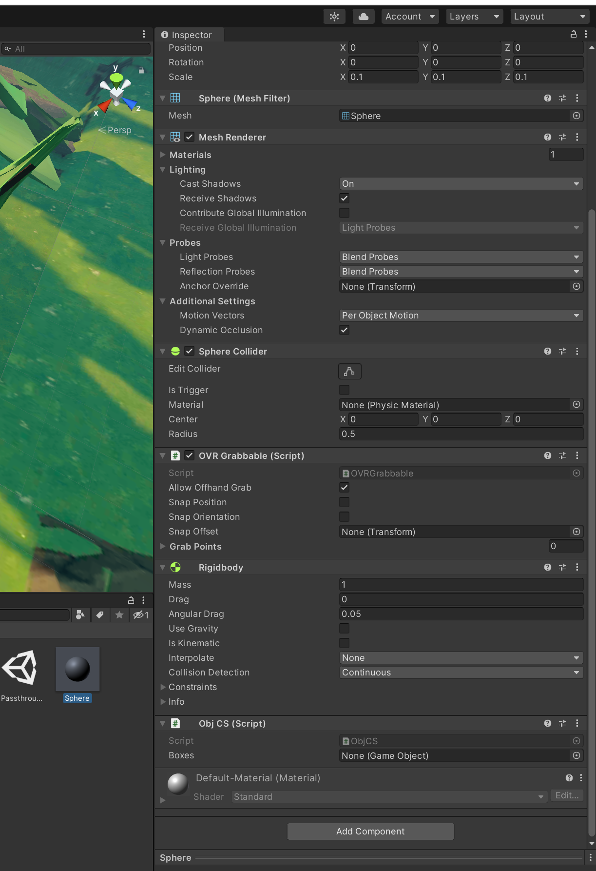 다음과 같습니다. 이때 사용자가 컨트롤러로 grab해서 잡을 수 있을려면 collider와 ovr grabbable 컴포넌트가 필요합니다.