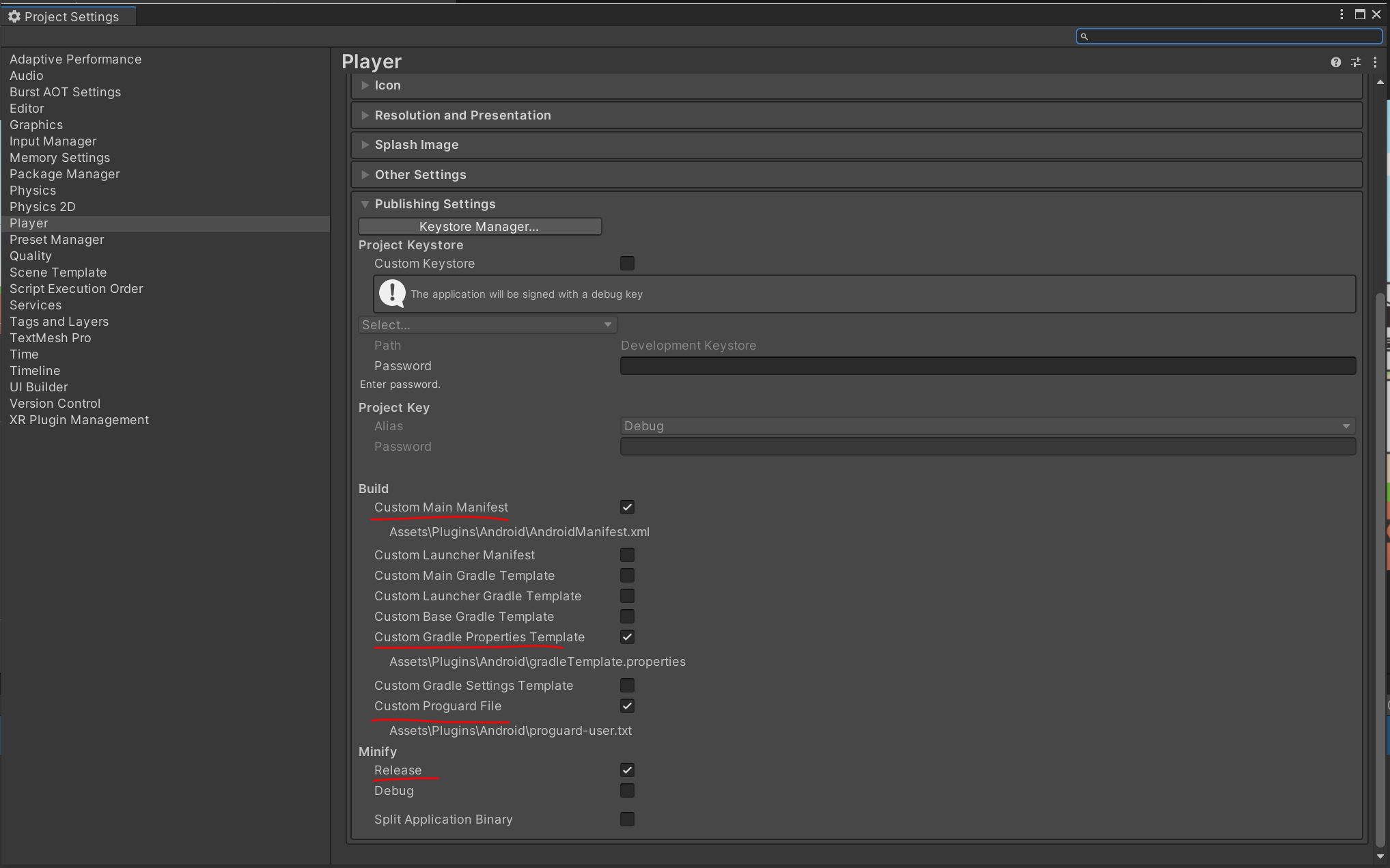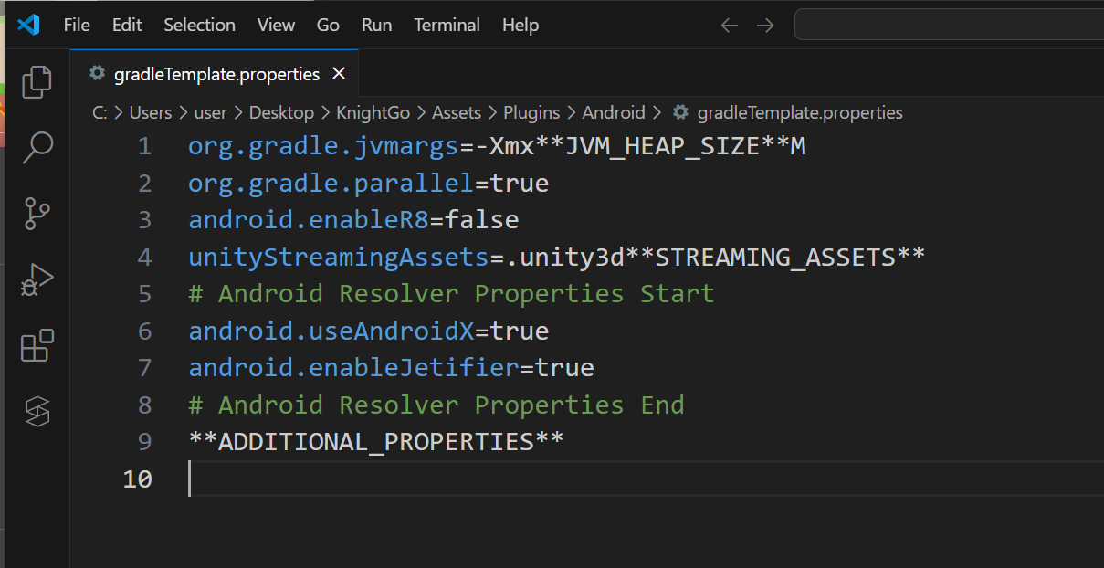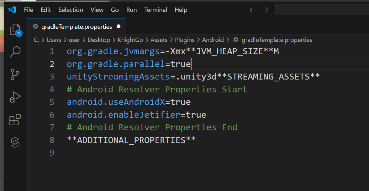 위 사진과 같이 Assets 부분에 Plugins 이 생기고 Android가 생깁니다. 그 이후 로그에서 알려준 오류난 위치를 찾아서 파일을 찾으면 ( project property -> 실제 파일 이름 gradleTemplate.properties 였습니다. 대충 비슷한 파일을 찍어서 확인해볼 수 밖에 없는 것 같습니다)