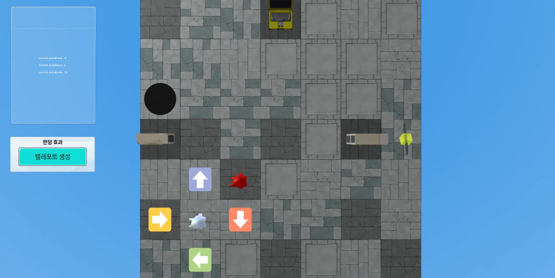 텔레포트 생성 효과 경우, 그림과 검은 색 홀을 랜덤으로 생성해서 플레이어가 해당 지점에 도착하면 빨간 홀 또한 랜덤으로 생성해서 플레이어가 빨간 홀 쪽으로 이동하게 됩니다.