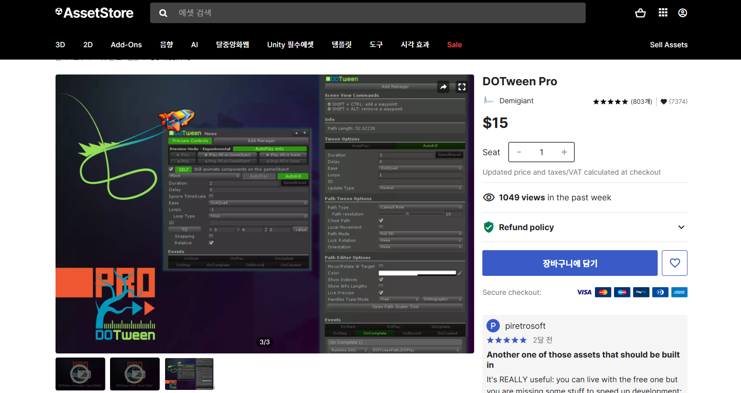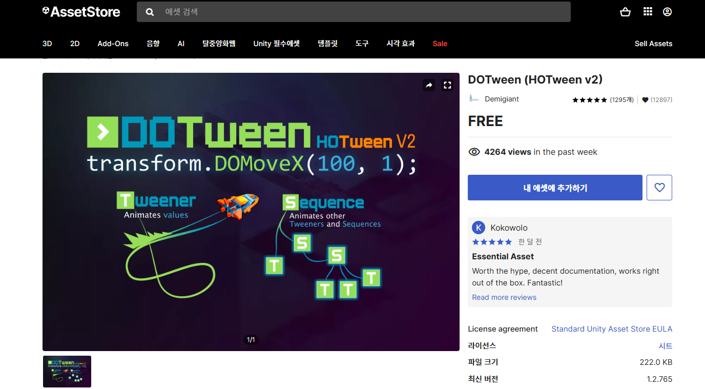일단은 여기까지 완성하고 추후에 더 뭔가 있으면 업데이트 해볼까 합니다. 애니메이션을 사용하기 위해서 다트윈, 닷트윈으로 불리는 유니티에서 유명한 애니메이션 에셋을 사용했습니다. 모르시는 분을 위해 유니티 에셋 스토어 링크 올려드립니다.