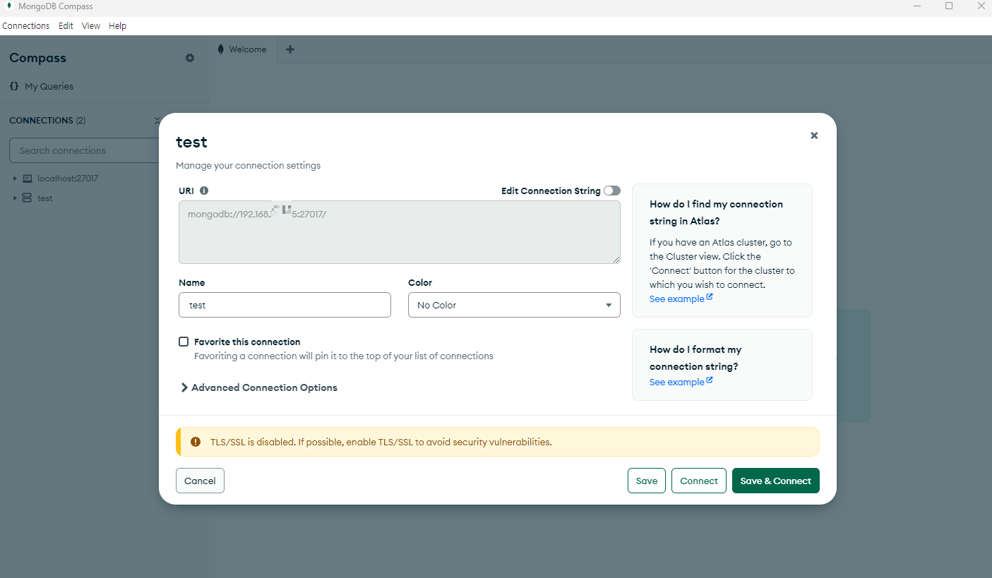 그리고 mongoDB Compass 를 가서 새로운 New Connection 을 만들고 URI 을 사설 IP 이런 mongodb://192.168.x.x:27017/ 식으로 설정해주면 저는 이제 태블릿에서 192.168.x.x:27017 을 통해 접속할 수 있게 되었습니다.