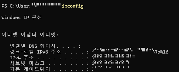 cmd 창을 켜서 "ipconfig" 명령어를 입력하면 쭉 무언가 뜨고 그 중에 IPv4 주소가 바로 내 컴퓨터 사설 IP 주소입니다.