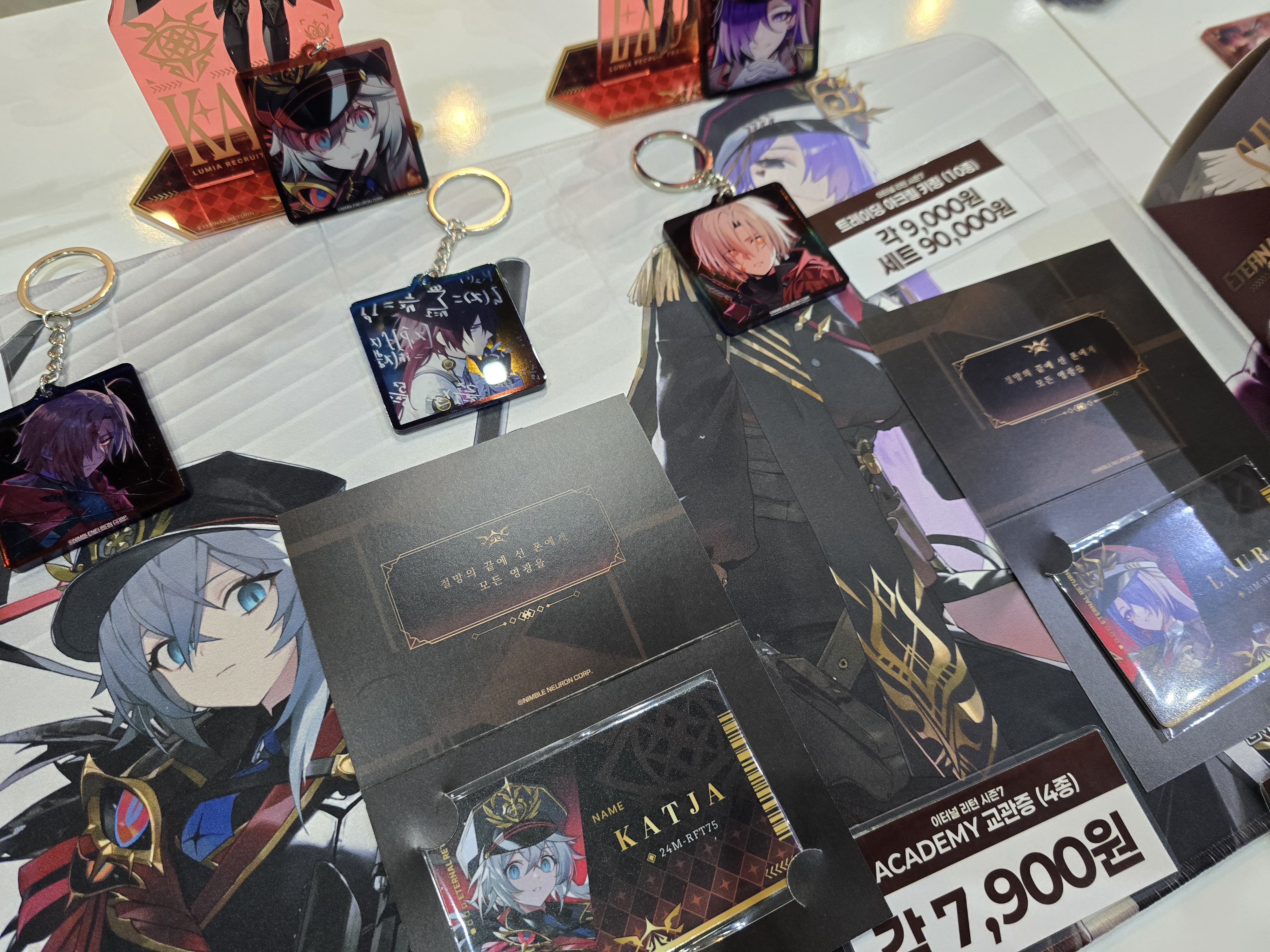 그 다음에 간 곳은 제가 요즘 자주하는 이터널 리턴 존인데 여기는 게임을 한 판 플레이하면 관련된 굿즈를 준다고 합니다. 하지만 이미 사람이 꽉... 최소 2시간 기다려야한다고 적혀있어서 일단은 포기하고 다른 거 구경했는데 공식 굿즈를 판다고 합니다. 사진 보시다싶이 퀼리티가 너무 이쁜 것 같습니다.