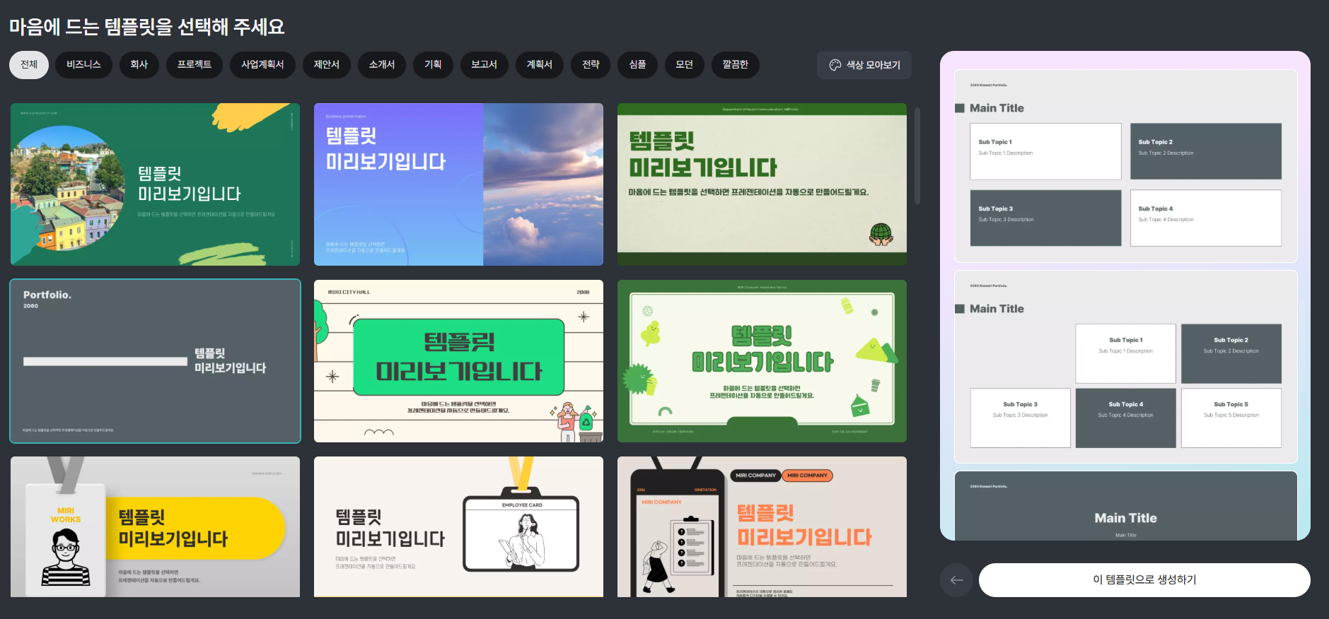이건 진짜 미리캔버스에만 있는 것 같은 AI 기술! 무려 PPT 를 만들어준다고 합니다.