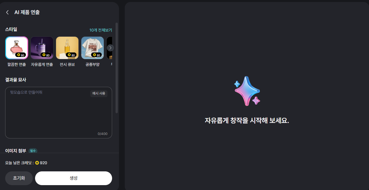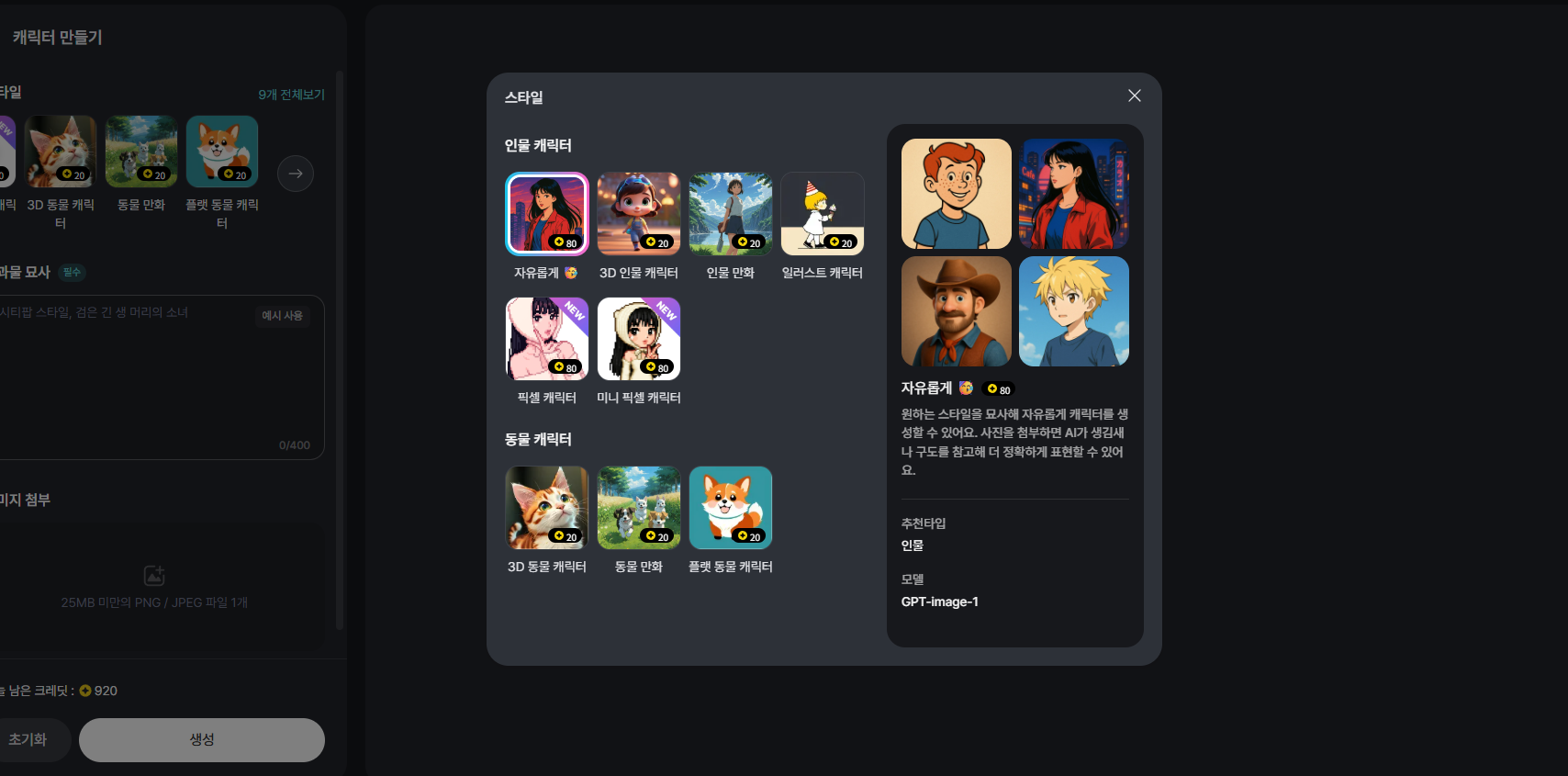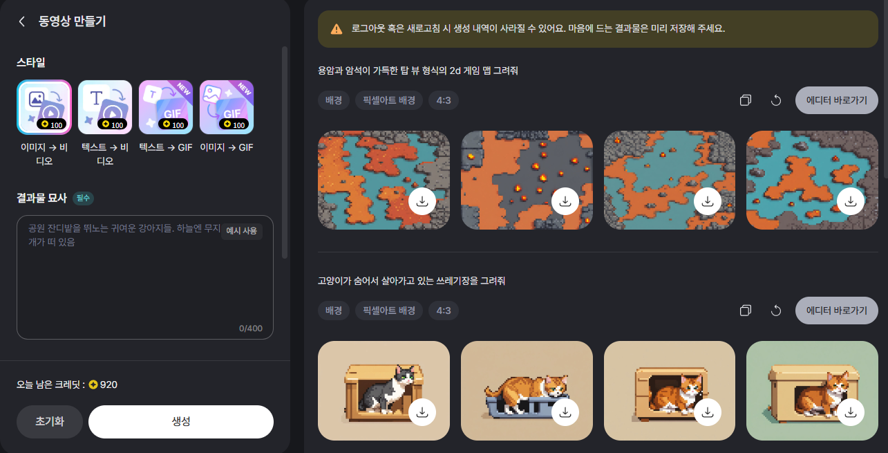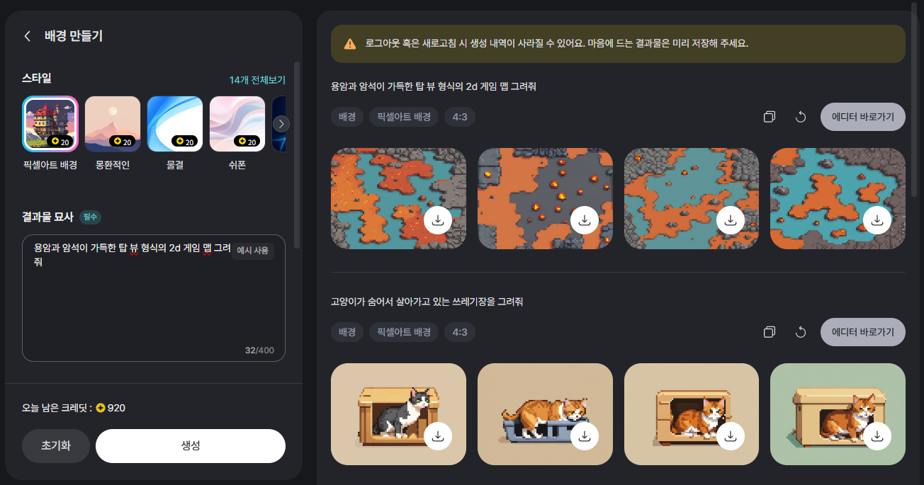 스타일을 정하고 만들고 싶은 결과물을 묘사하면 되는데 저는 위와 같이 작성해서 생성했습니다.참고로 생성하기 위해서는 크레딧이 필요한데 멤버쉽하면 하루 1000 크레딧 / 무료 회원이면 100 정도인가 제공됩니다