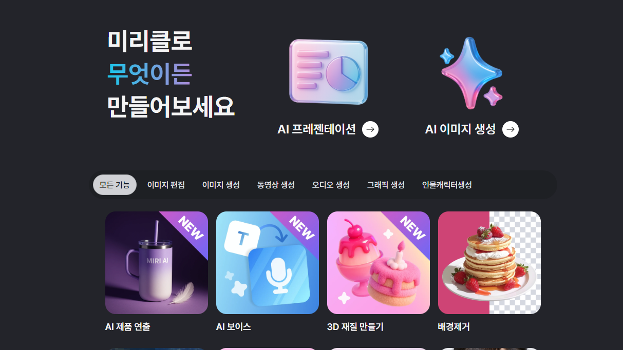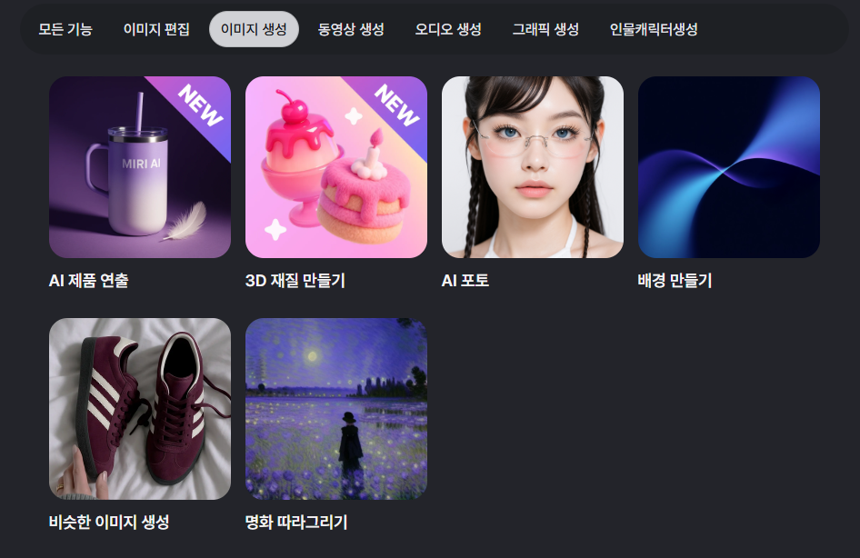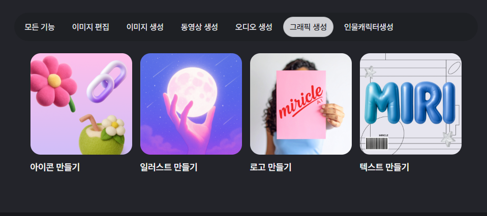 들어가면 다음과 같은 화면이 뜹니다. 그렇다면 과연 어떤 걸 AI 로 만들 수 있는가 했을 때, 미리 캔버스는 정말 다양한 것을 지원하는 것 같습니다.