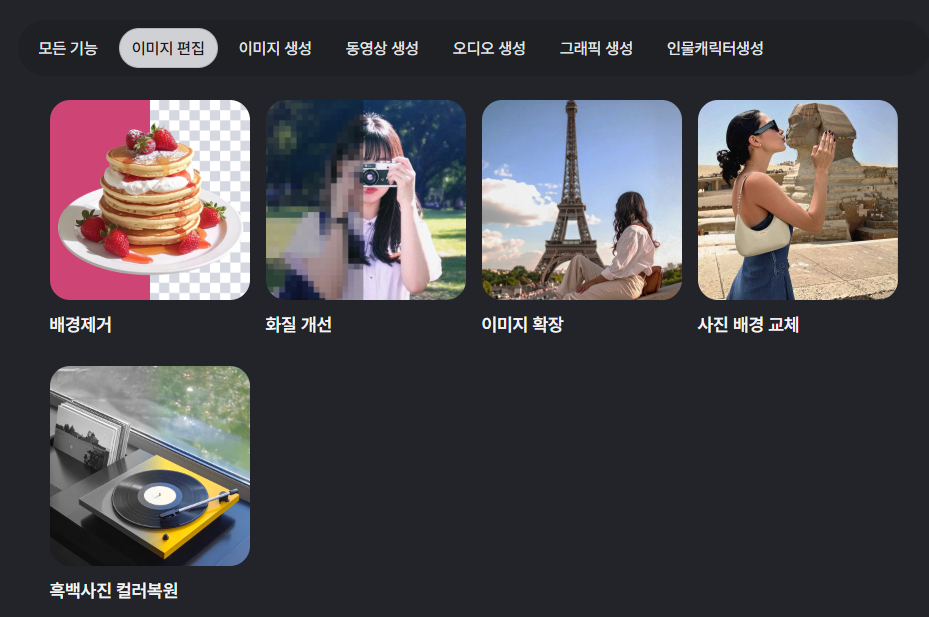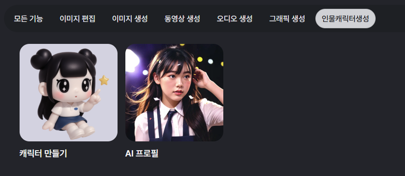 일단 크게 이미지 쪽을 보다면 사진 편집, 생성, 일러스트, 글자 등등 있고 여기서 끝이 아니라 안에 들어가면