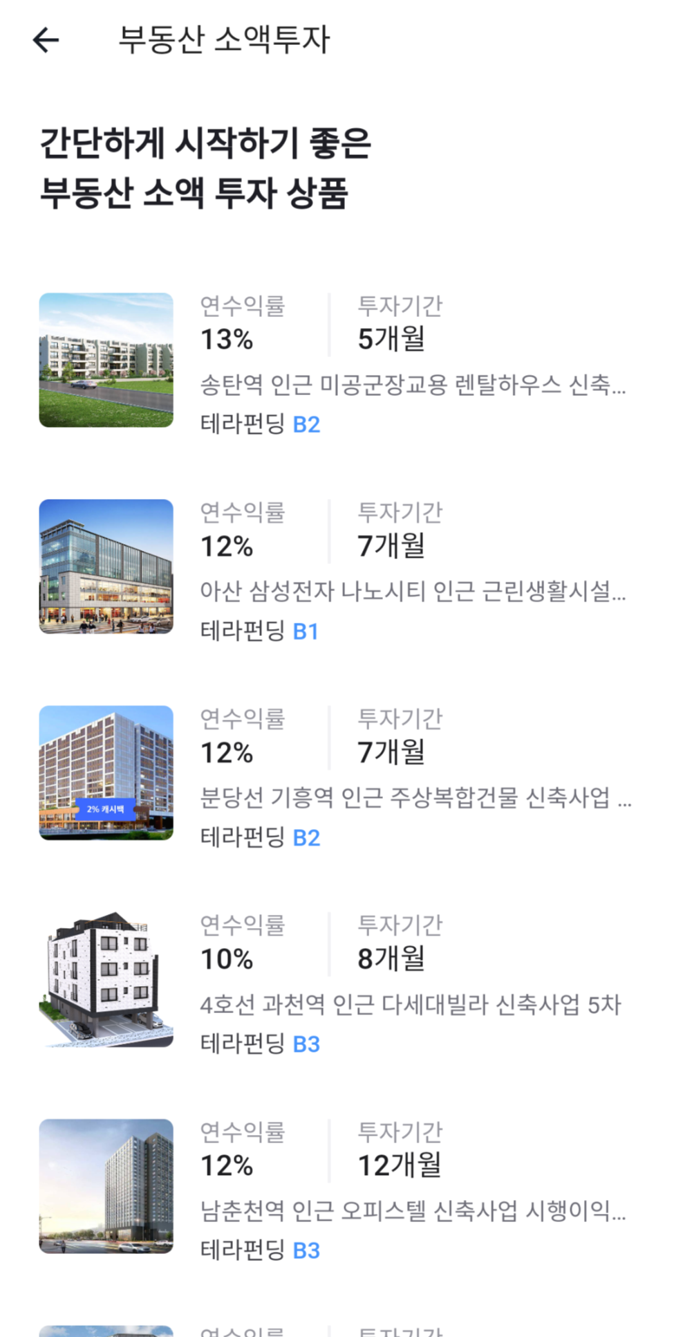 일단 토스 부동산 소액 투자 목록에 들어가면 아래와 같은 목록들이 쭉 있습니다.