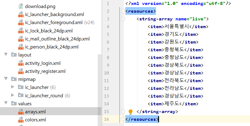 2. values > arrays 파일을 만들어서 넣을 목록을 쭉 적는다.