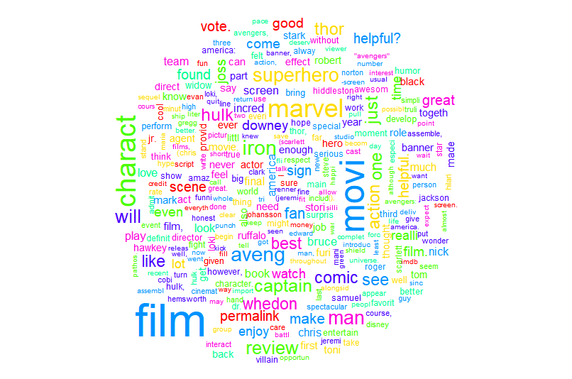wordcloud(words = names(wordFreq), freq = wordFreq, random.color = T, colors = rainbow(7))