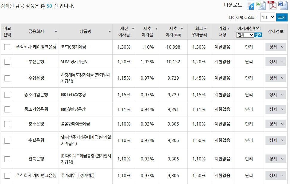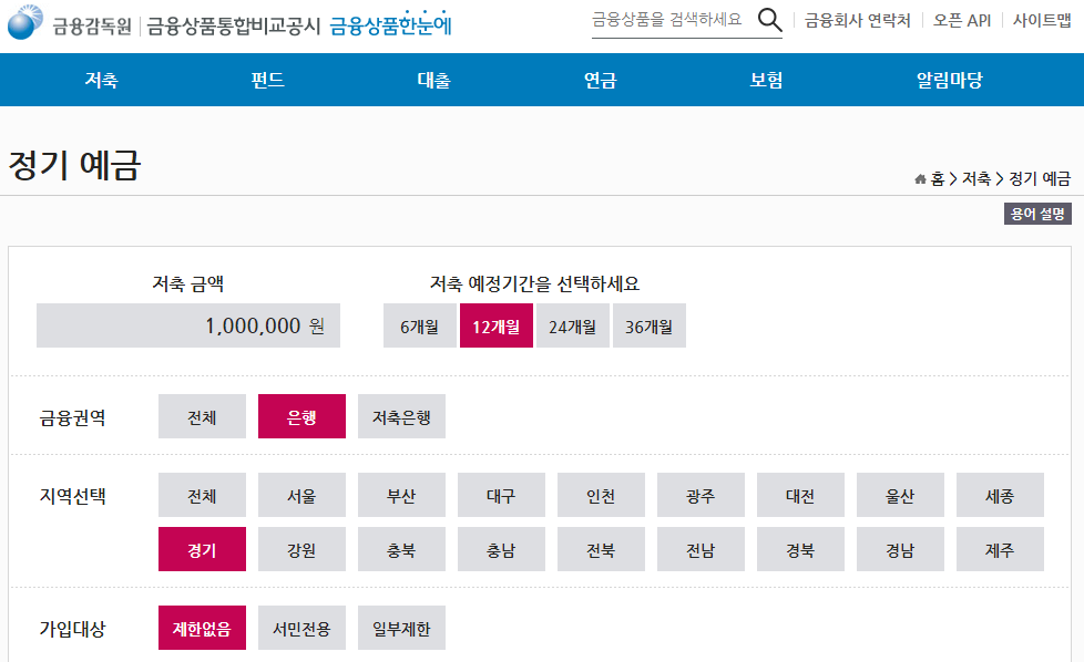 사이트에서 저축 금액, 기간, 금융권역, 지역 등등을 설정하면 이자율이 높은 순으로 나열을 해줍니다.