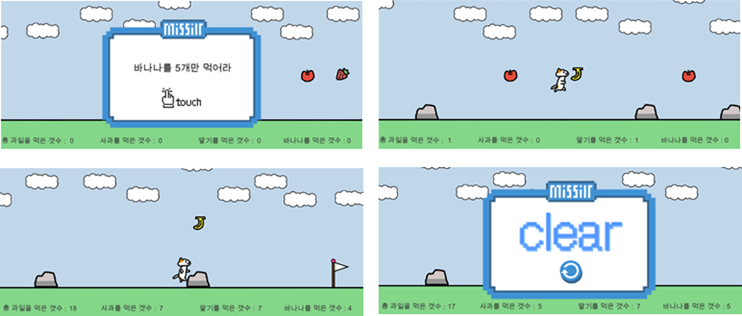 처음에 먹어야 되는 과일 개수에 대한 미션 지를 주어 플레이하는 동안 계속 머릿속으로 생각하며 게임을 플레이함으로서 기억력 유발 활동