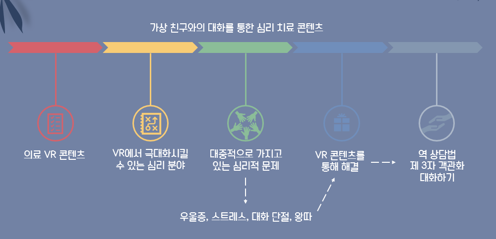 주제 및 주제 선정 이유 : 의료 VR 콘텐츠 개발 목표 그 중에서 효과를 극대화 시킬 수 있는 심리 치료를 잡게 되었고 심리 쪽에서 가장 대중 화적인 요소가 무엇이 있을까 생각했을 때 우울증, 생활 스트레스, 왕따와 같은 부분을 생각하게 되었다. 위에 와 같은 요소 해소 방법으로 상담가가 아니더라도 혼자 이야기를 털어놓는 것만으로도 해소 효과가 나타난다는 논문과 제 3자 객관화를 통해 자신을 되돌아 보는 것 또한 효과가 입증된 것을 알 수 있었고 이러한 논문 이론들을 활용하여 VR 콘텐츠를 개발하고자 한다.