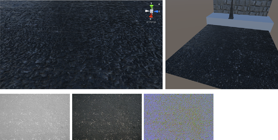- 가로수 길 배경, 물결, 비, 물의 파동, 반사, 물이 차오르는 애니메이션, 화면 일그러지는 효과 구현