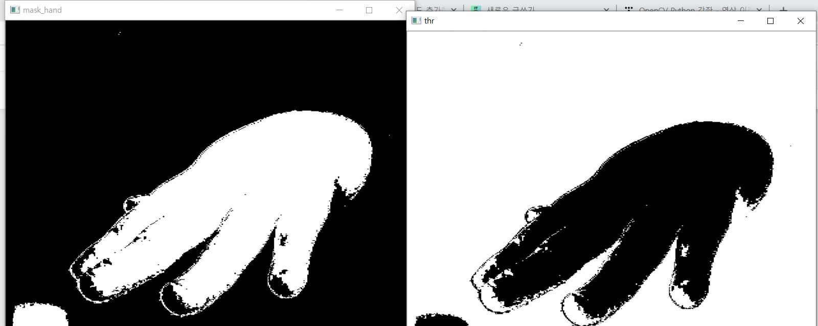 하지만 ret, thr = cv2.threshold(mask_hand, 127, 255, cv2.THRESH_BINARY_INV) 를 빼고 적용시켜 본 결과 딱히 큰 차이 없는 듯 이 부분은 없어도 되는 거 같다.