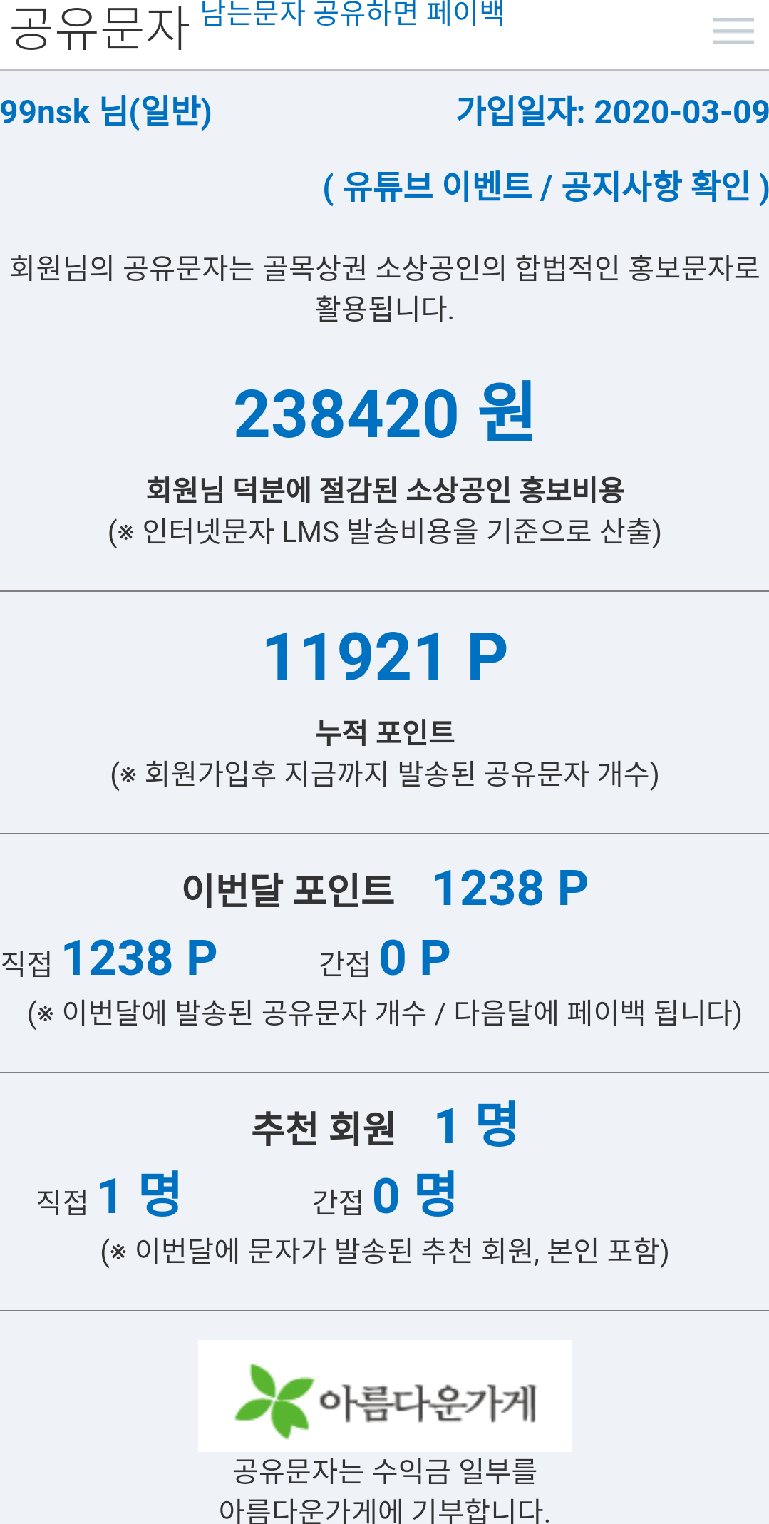 사기 아닐까 싶지만 실제로 저는 6 개월 정도 사용해보았으며 그동안 얼마만큼 내 문자 공유를 통해 소상공인들의 홍보비용이 절감되었고 얼마 정도 수익을 얻었는지 아래 페이지에서 알 수 있습니다.